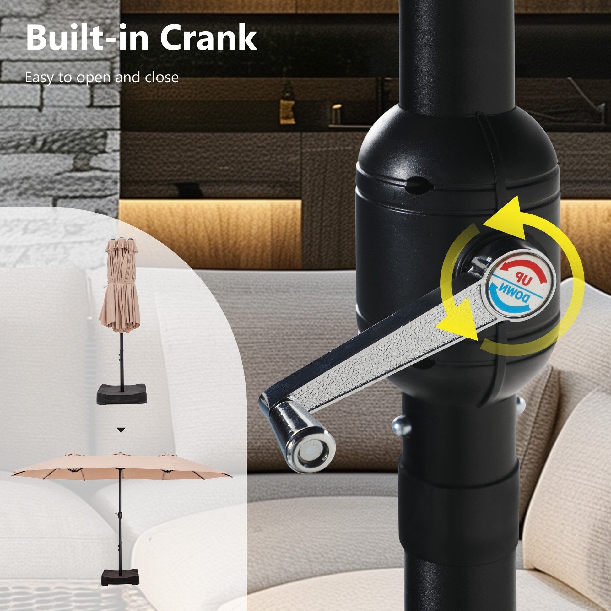 Parasol de marché d'extérieur rectangulaire de 4,57 m (15 pieds) à manivelle, double face, avec éclairage solaire LED et base incluse.