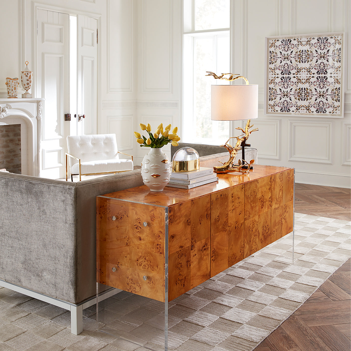 La rigueur architecturale rencontre la chaleur du bois de loupe dans notre collection Bond. Des pièces de bois de mappa semblent flotter entre des pieds en acrylique rehaussés de détails en acier inoxydable. Une étagère intérieure réglable offre un espace de rangement, tandis que les façades des meubles révèlent les motifs uniques et naturels du bois. Un dos entièrement fini fait de ce meuble une pièce maîtresse idéale pour être placée au centre d'une pièce. Forme et fonction se conjuguent pour un résultat résolument moderne.