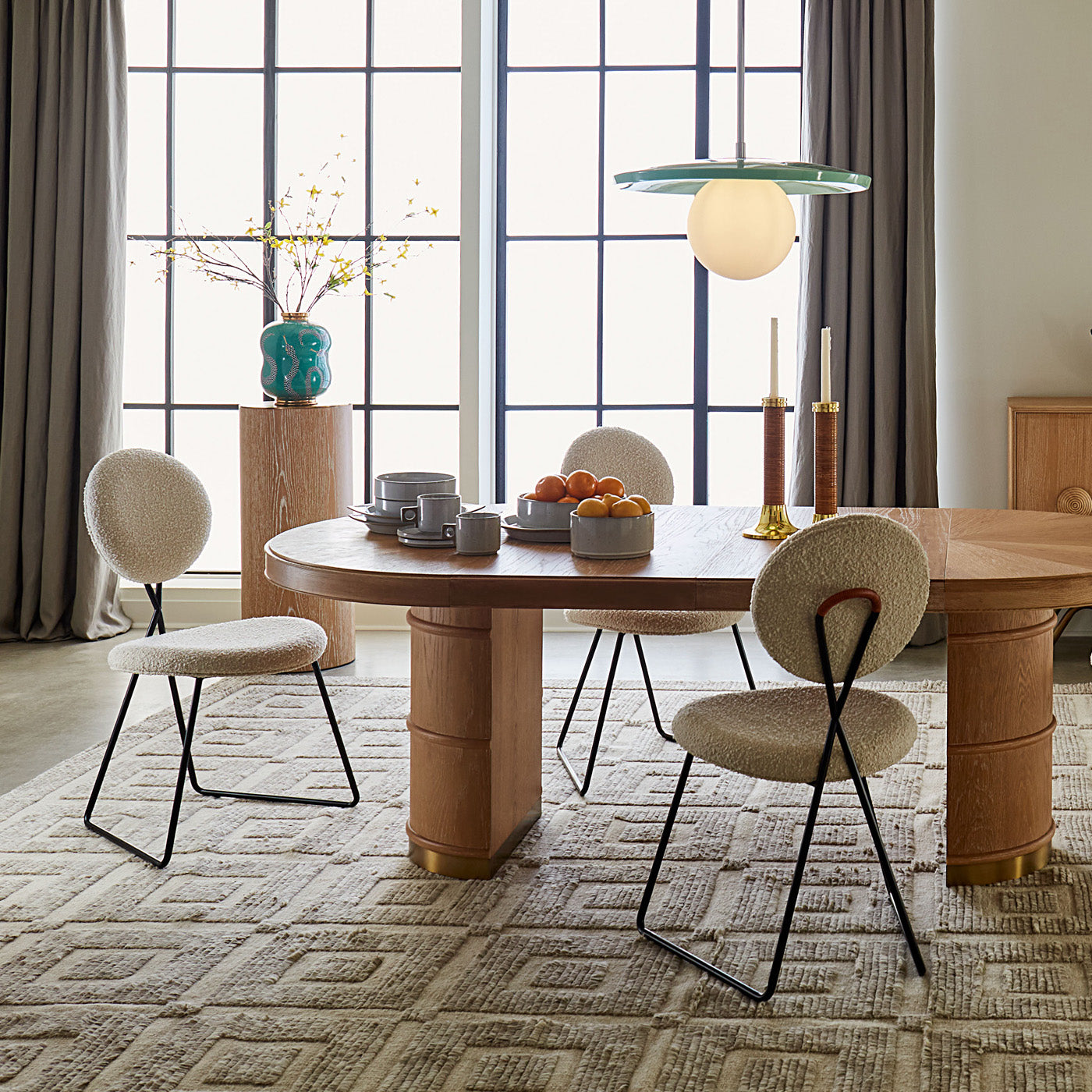 Un plateau de table robuste en chêne massif brossé et légèrement cérusé, orné d'un motif radial, repose sur un piètement en laiton cerclé, inspiré du bambou, qui se divise pour accueillir une rallonge à deux abattants. Chic et intemporel. Jusqu'à 10 couverts.