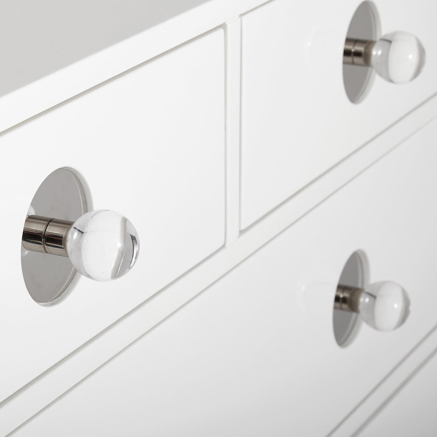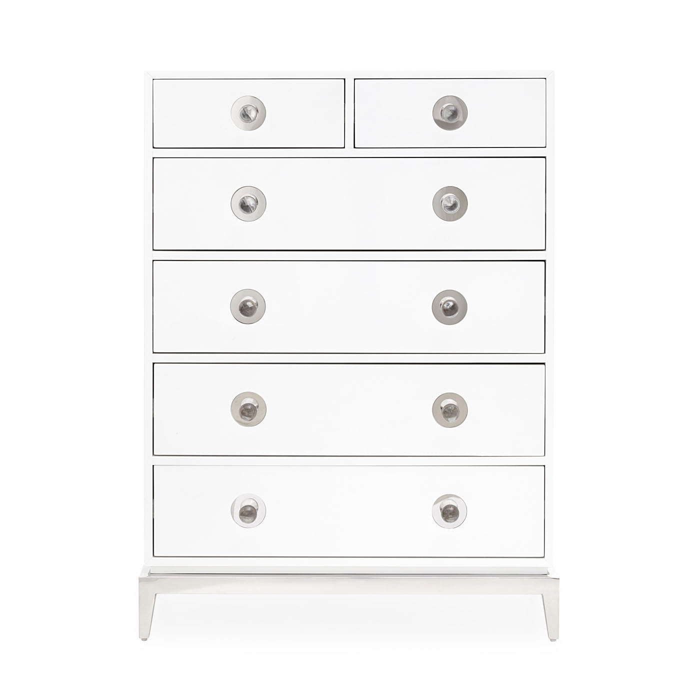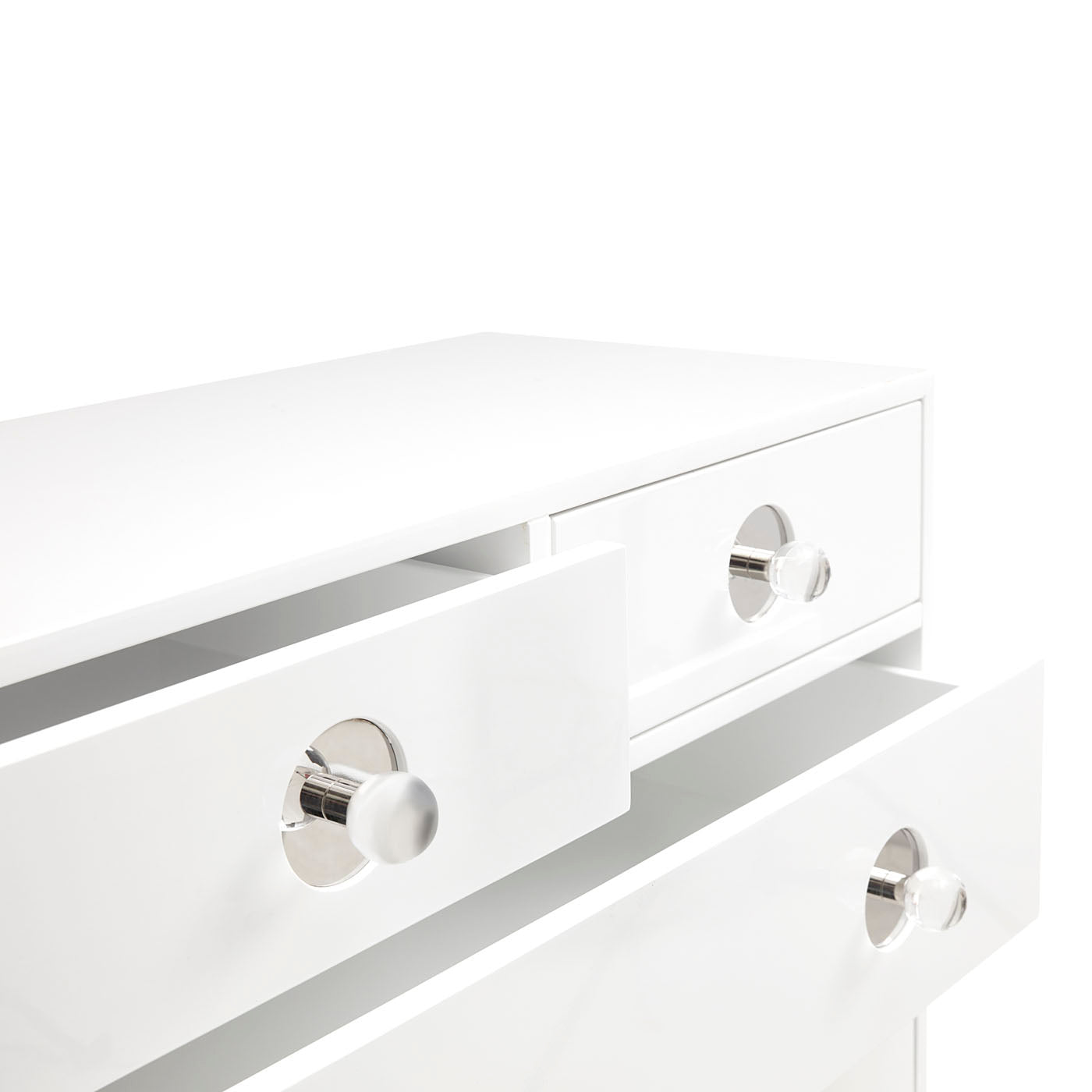Des lignes néoclassiques, une touche de glamour hollywoodien et une pointe d'audace moderne : voici notre collection Channing. Rangez vos affaires comme une star dans quatre tiroirs spacieux, surmontés de deux autres pour vos accessoires. Finition laquée brillante, accents en nickel poli et poignées surdimensionnées en acrylique.