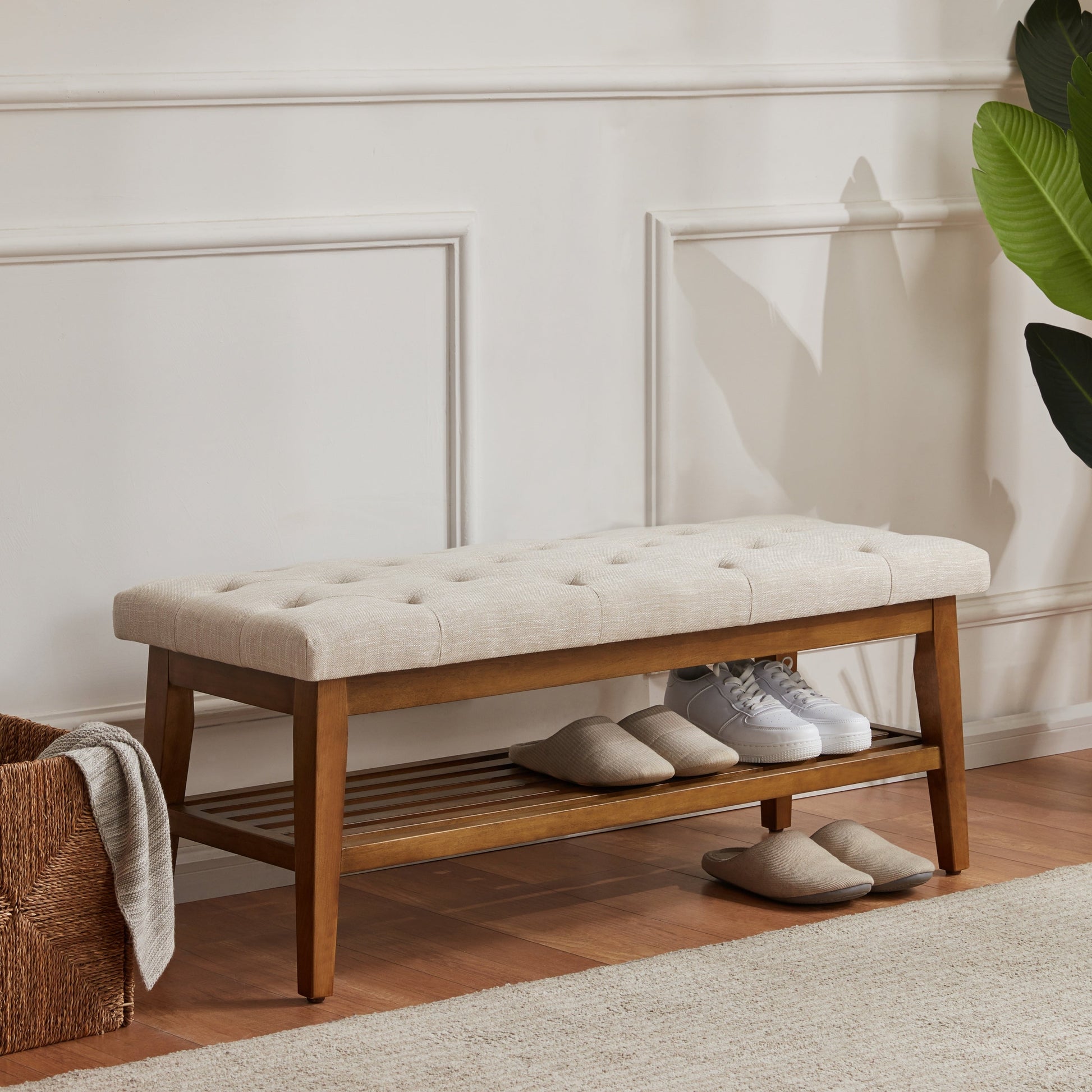 Banc à chaussures d'entrée avec rangement, revêtement en tissu et bois massif, 109 cm (43 pouces), banquette rembourrée pour salon et chambres