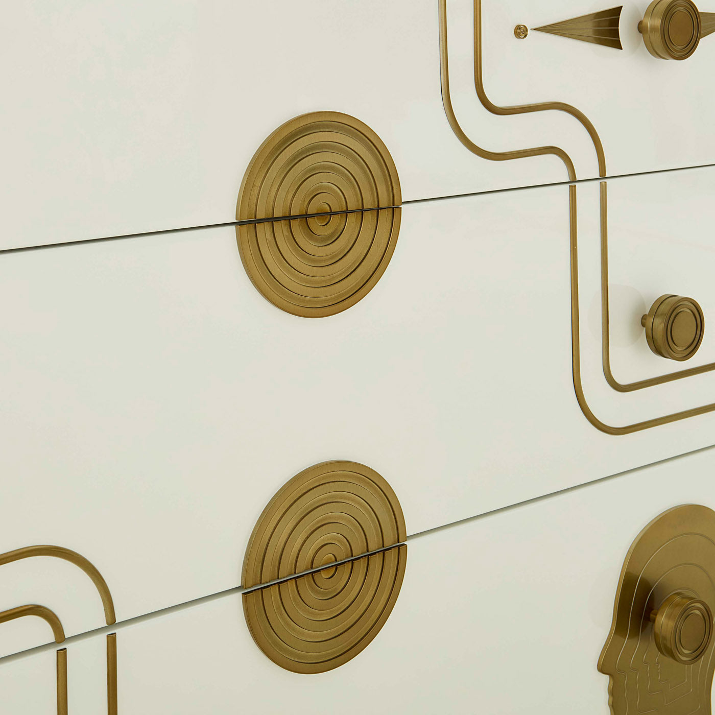L'élégance chinoise rencontre le glamour des années 70 et un charme intemporel : notre commode Gala réunit tous ces éléments. Son caisson laqué blanc brillant, reposant sur un socle encastré, met en valeur une interprétation moderne des ferrures traditionnelles en laiton et des ornements en laiton gravé. Ornée de motifs issus de nos collections préférées et encadrée par des angles de style campagne, cette commode est une pièce que vos héritiers se disputeront. Surmontée d'un plateau en verre trempé, elle offre trois tiroirs spacieux et deux placards dotés chacun d'une étagère réglable. Un meuble aussi fonctionnel qu'exceptionnel, qui trouvera sa place dans n'importe quelle pièce.