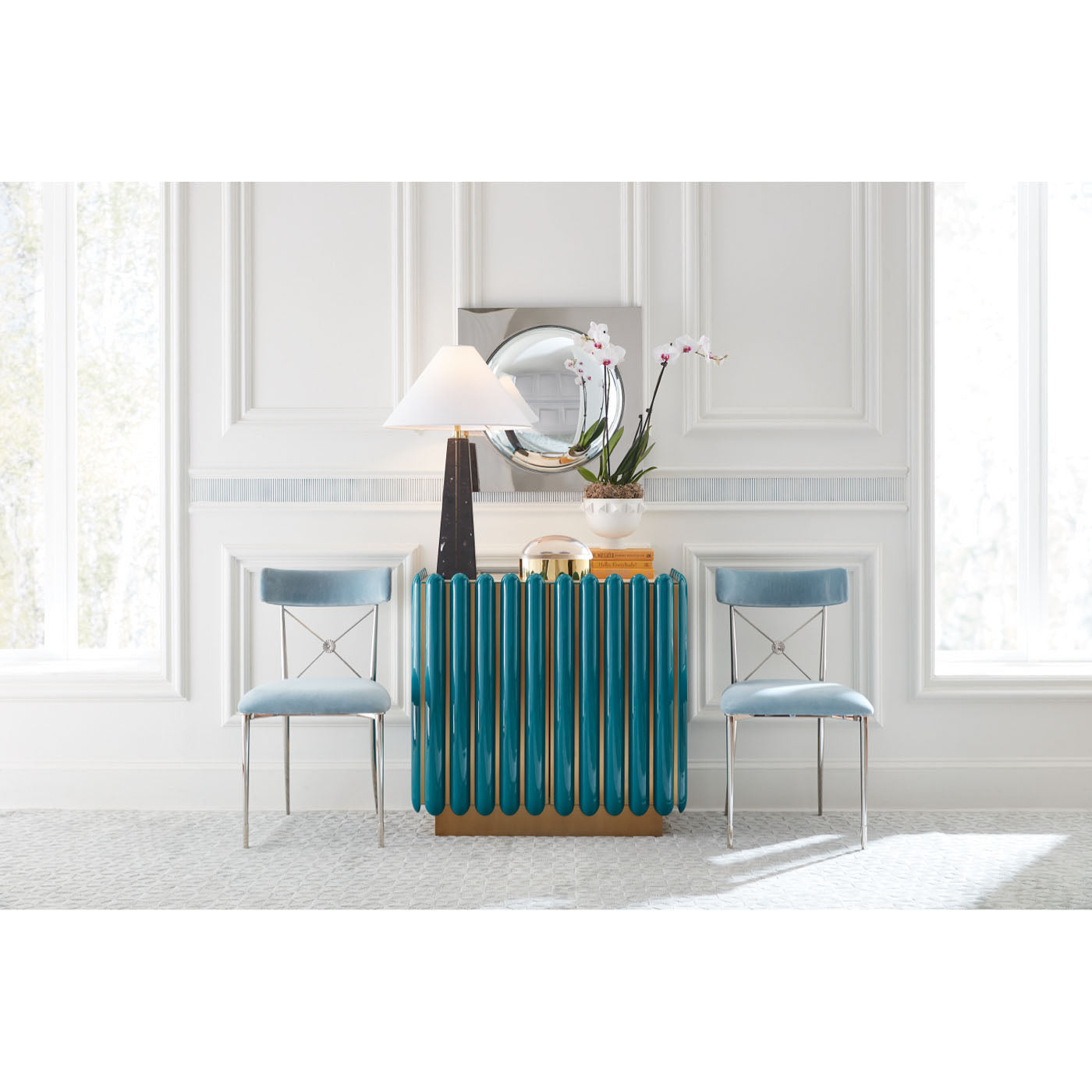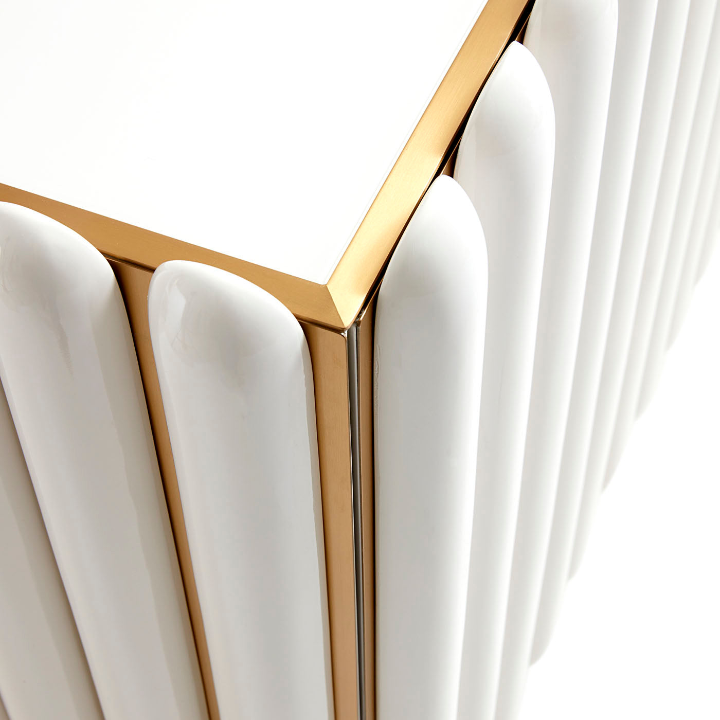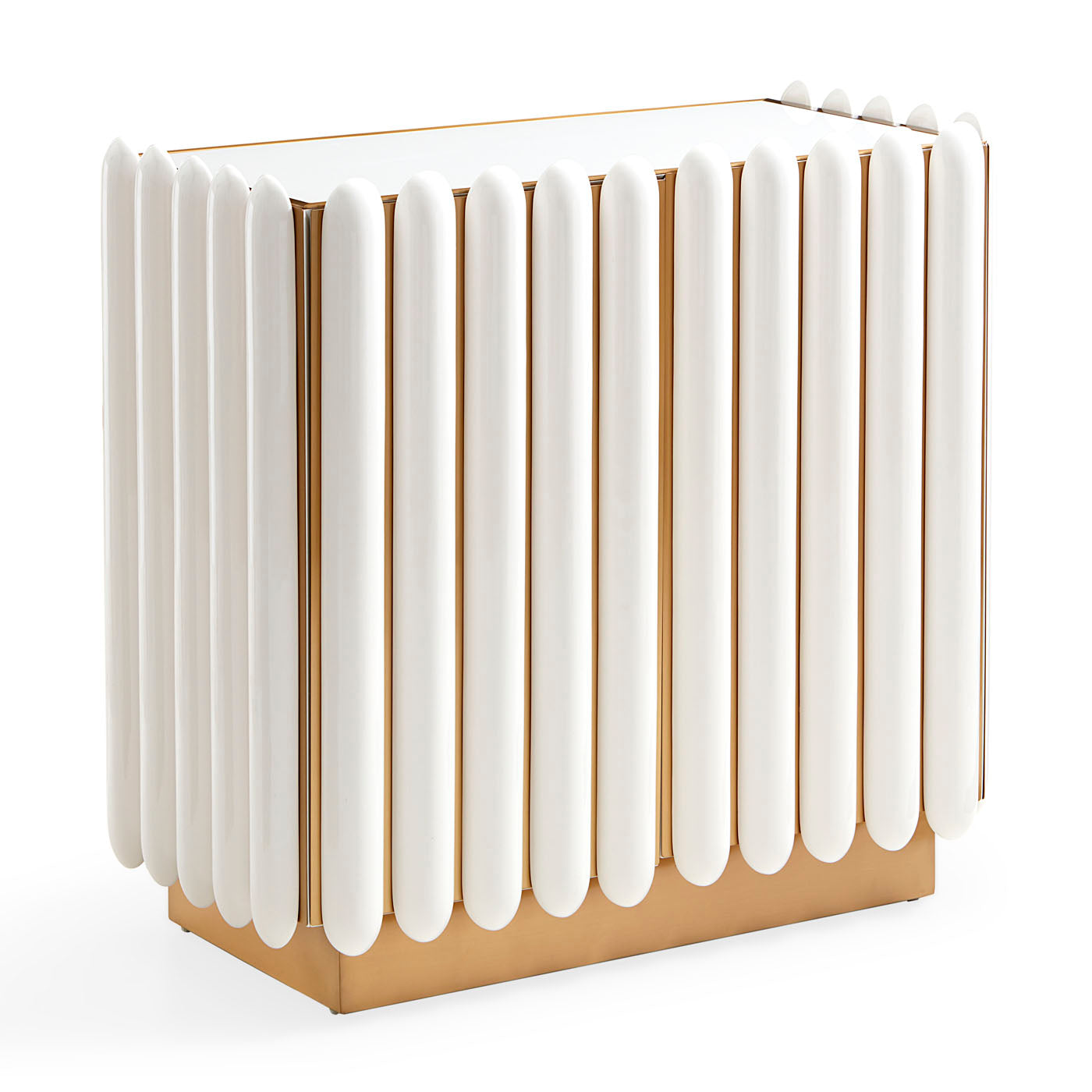 Un meuble en laiton brossé, orné de capsules bombées laquées bleu canard profond ou ivoire, surmonté d'un plateau en verre peint ivoire reposant sur un socle encastré. Son intérieur comprend deux tiroirs à fermeture amortie doublés de velours et une étagère réglable. Un meuble résolument futuriste, aussi fonctionnel que glamour.