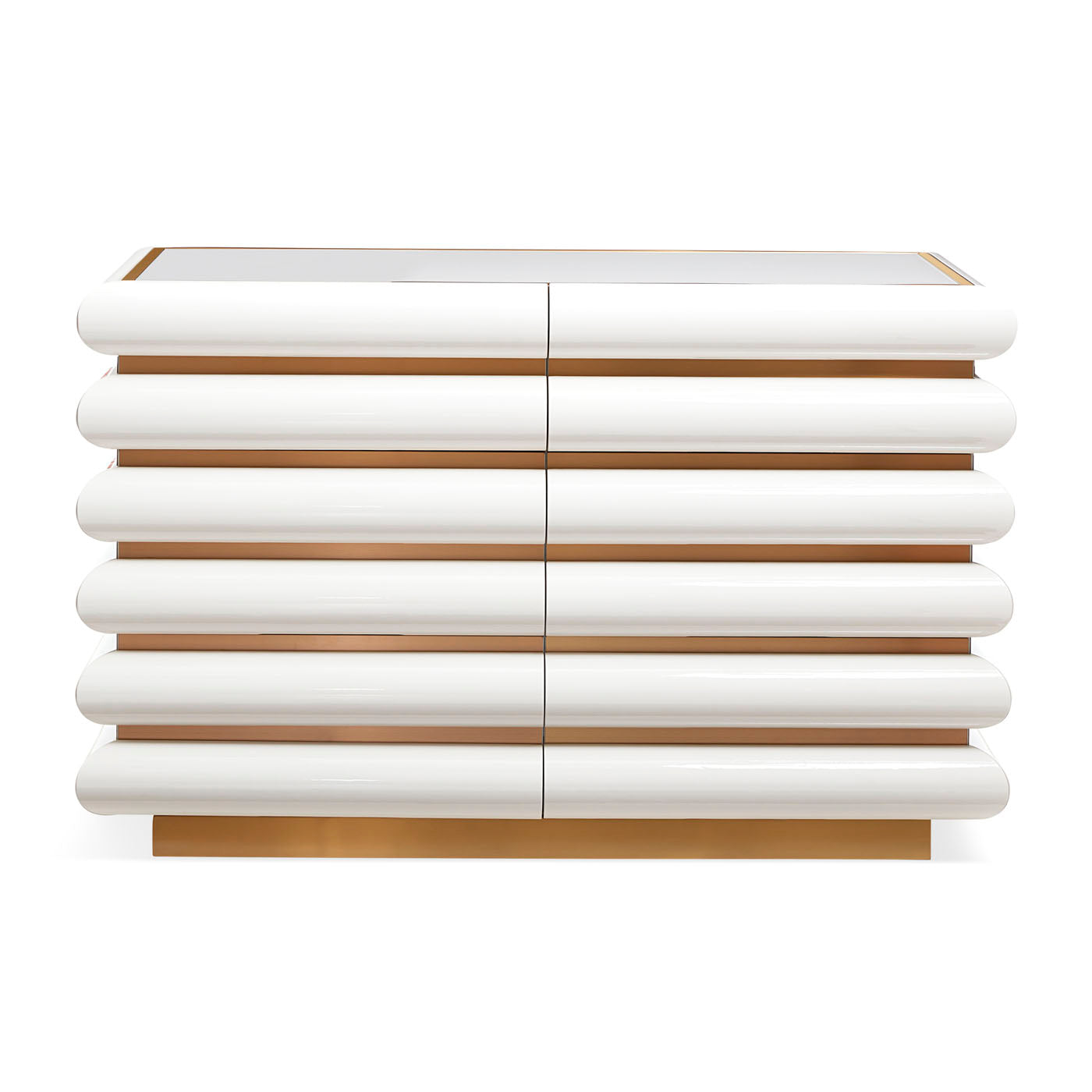 Posée sur un socle encastré, notre commode Kiki présente un meuble en laiton brossé orné de capsules bombées laquées ivoire brillante. Surmonté d'un plateau en verre peint ivoire, il est doté de six tiroirs intérieurs doublés de velours pour ranger vos effets personnels. Un meuble résolument futuriste pour un grand hall d'entrée et tout aussi glamour pour un boudoir moderne.
