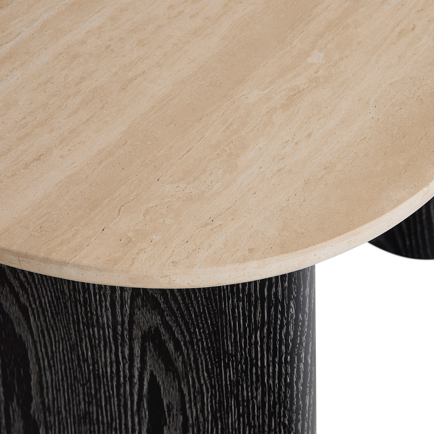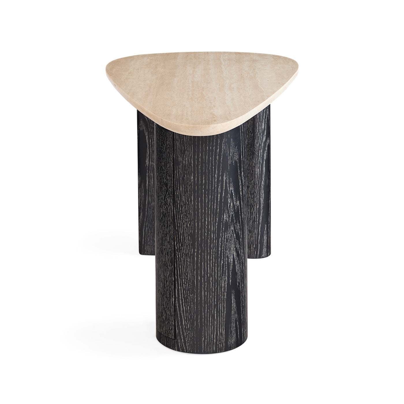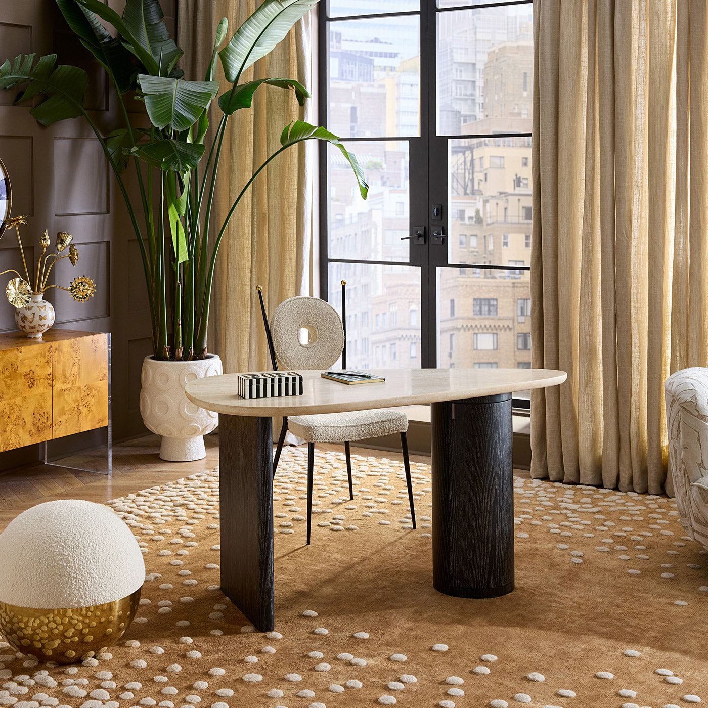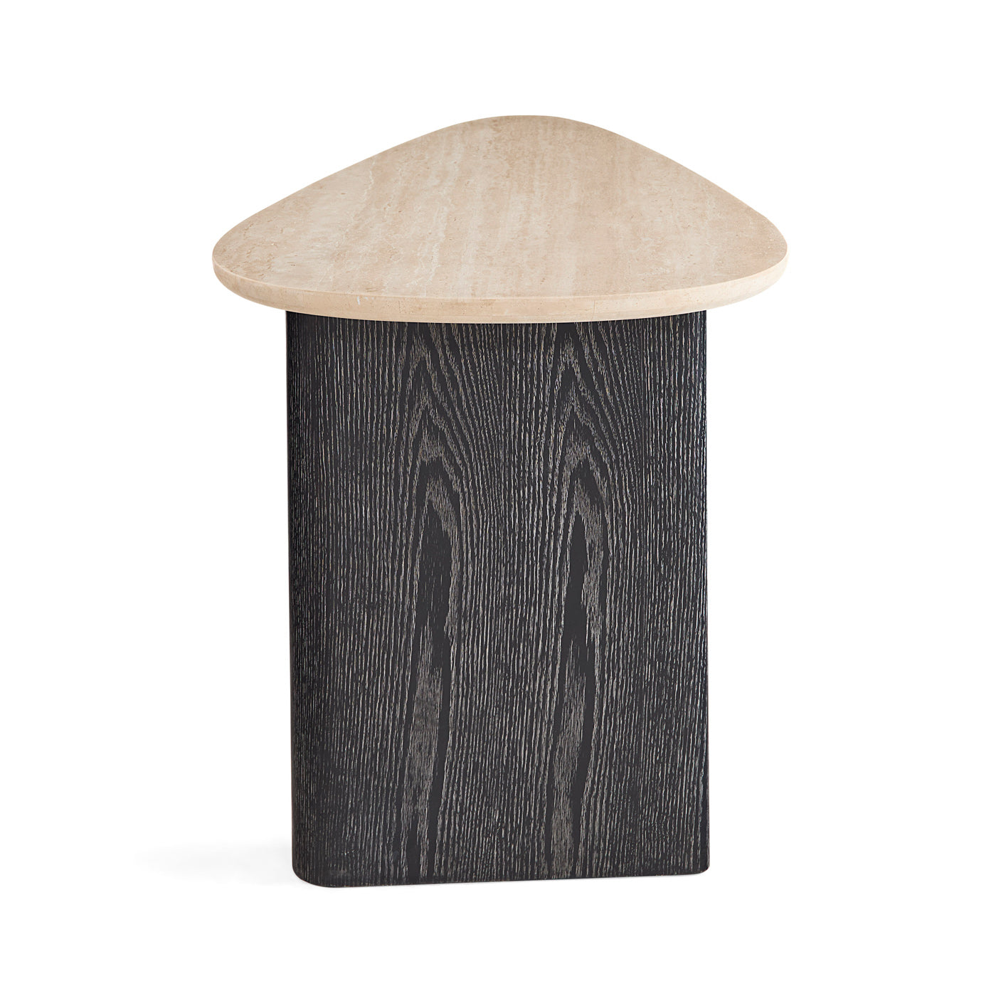 Avec son plateau aux formes familières inspirées du design du milieu du siècle, notre bureau Oeuf est réalisé en travertin luxueux, reposant sur des supports asymétriques en chêne ébénisé à la finition brossée. Son pied en forme de tonneau s'ouvre pour révéler un espace de rangement intérieur. Parfait dans un coin détente ou un bureau élégant, il s'intègre harmonieusement dans n'importe quelle pièce pour créer un espace de travail chic qui se transforme en sculpture abstraite.