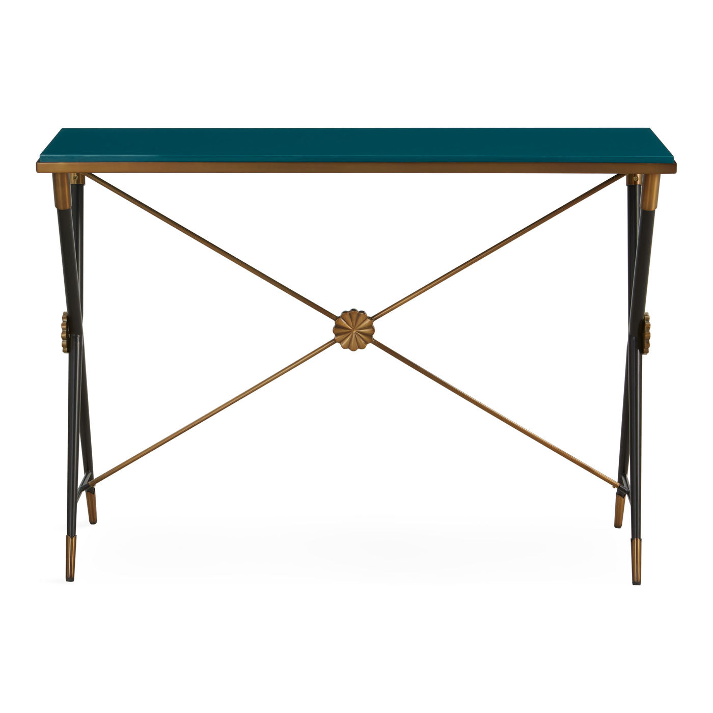 Notre collection Rider revisite le style Empire français classique. Un plateau laqué bleu canard brillant sur une structure en acier noirci, ornée de sabots et d'écussons en laiton, lui confère une élégance contemporaine. Son piètement élancé lui donne une allure légère et dynamique. Solution de rangement raffinée pour votre entrée, elle trouve également sa place avec élégance derrière votre canapé.