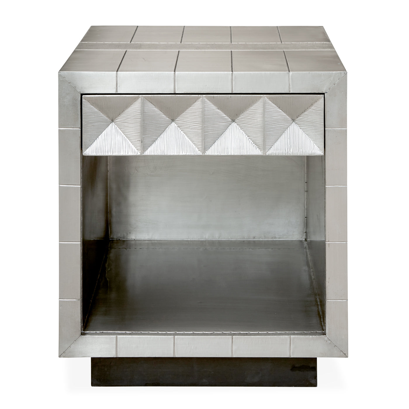 Élégante et raffinée, notre table de chevet Talitha est confectionnée en métal nickelé orné de motifs estampés à la main sur une forme minimaliste. Sa surface, évoquant la feuille d'argent, diffuse le même éclat lustré, tout en offrant une résistance exceptionnelle. Laissez le motif géométrique illuminer votre chambre glamour ou affirmez un style plus rock dans un espace plus épuré.