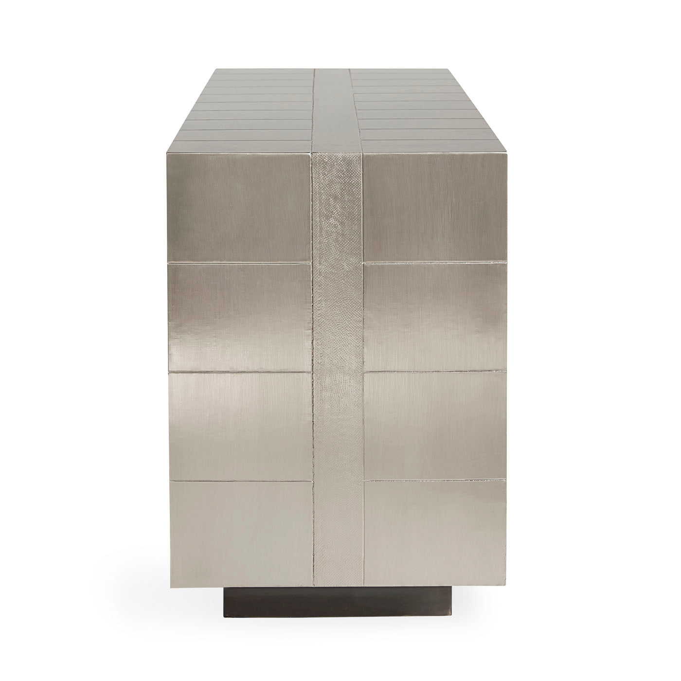 Notre collection Talitha est confectionnée en métal nickelé, ornée de motifs estampés à la main sur des formes minimalistes et modernes. La surface de notre buffet évoque la feuille d'argent – elle en dégage le même éclat – tout en étant d'une résistance exceptionnelle. Des dimensions généreuses et une présence affirmée, tout en restant légère et élégante. Le motif géométrique clouté apportera une touche rock à votre intérieur.
