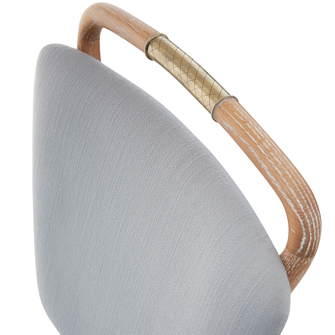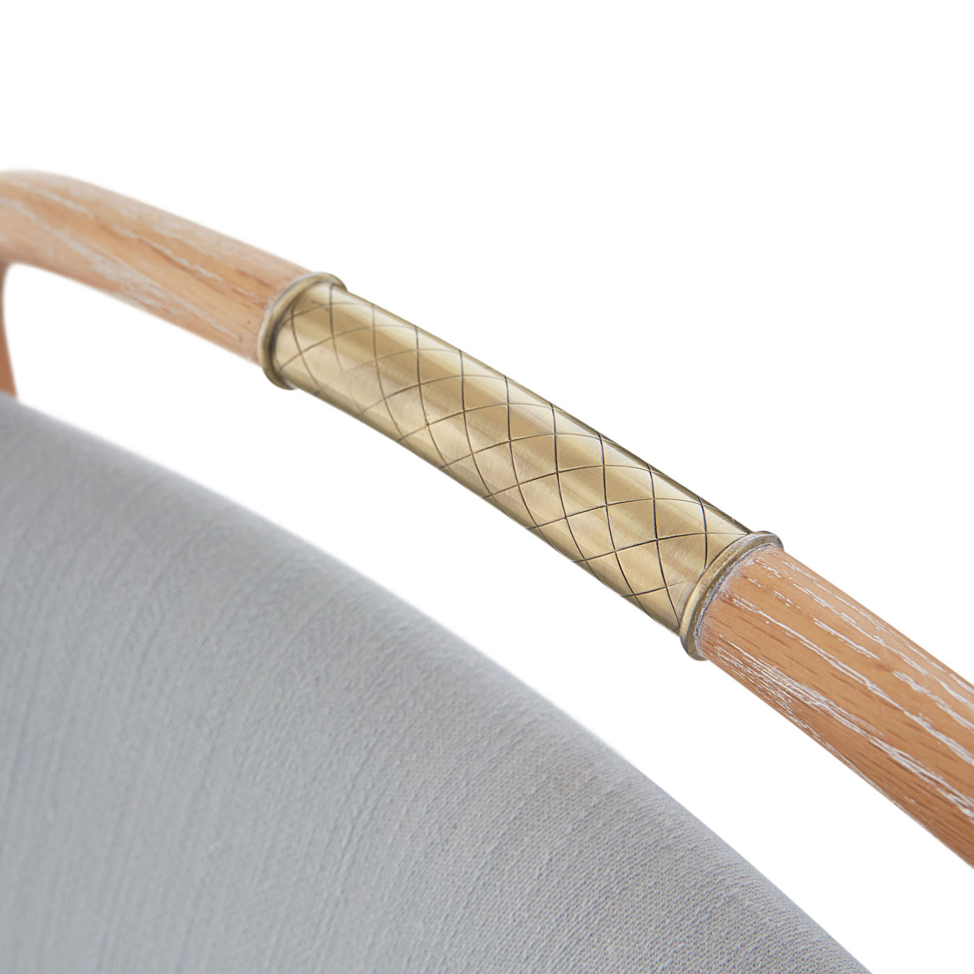 Version en chêne massif de notre emblématique structure en laiton cintré, la chaise de salle à manger Torino à dossier en X présente une structure en chêne tourné en forme de X audacieux vue de l'arrière. Un détail en laiton brossé, faisant office de poignée, est orné d'un motif en filet assorti aux sabots des pieds avant. Dotée d'un dossier confortable et d'une assise moelleuse revêtue du soyeux tissu bleu glacier Tussah Sky, cette chaise est idéale autour d'une table à manger, associée à une autre pour encadrer une console, ou encore utilisée seule comme pièce maîtresse.