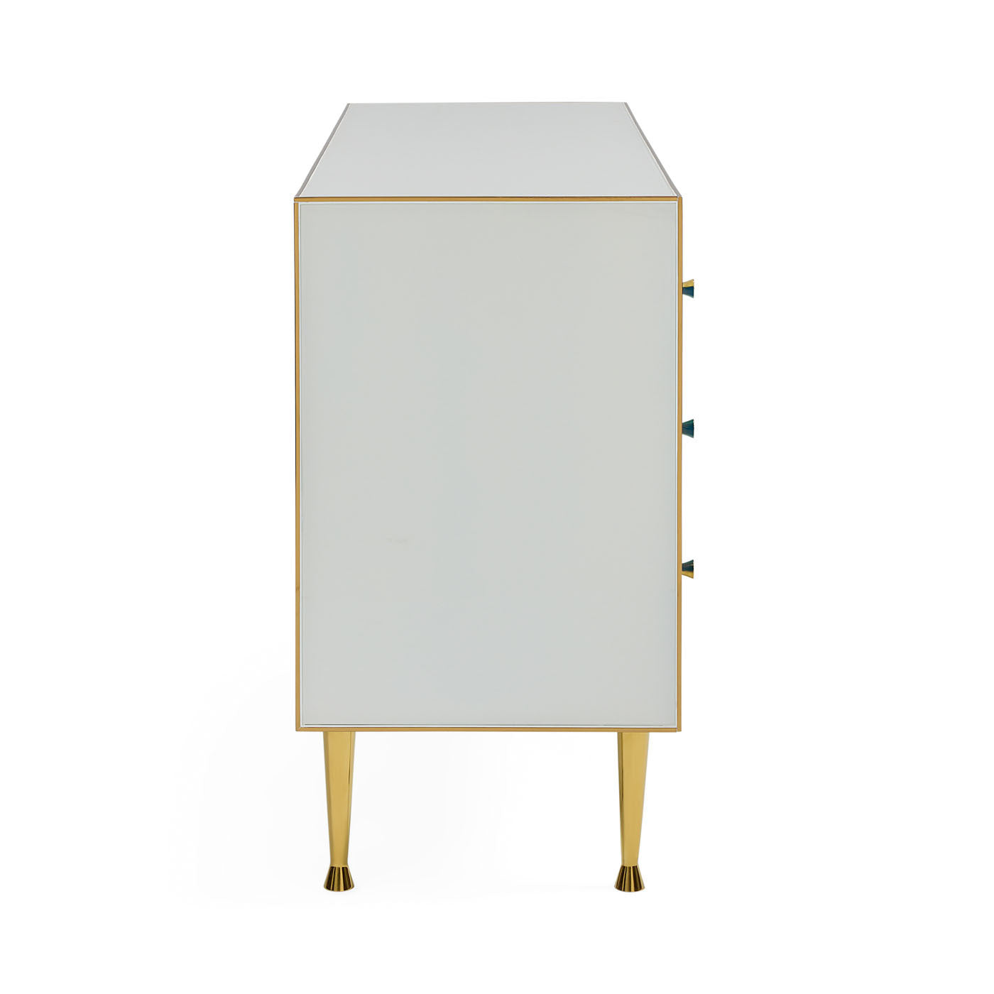 Apportez une touche marine à votre intérieur, de l'entrée à la chambre, grâce au motif à pois moderne de notre crédence Ultramarine. Confectionnée en verre laqué dans des tons de bleu méditerranéen rafraîchissants et ornée de bordures en laiton poli brillant, elle dispose de six tiroirs spacieux à fermeture douce, chacun agrémenté de deux poignées en laiton. Elle trouvera parfaitement sa place dans l'entrée, derrière le canapé ou à côté de votre table à manger.