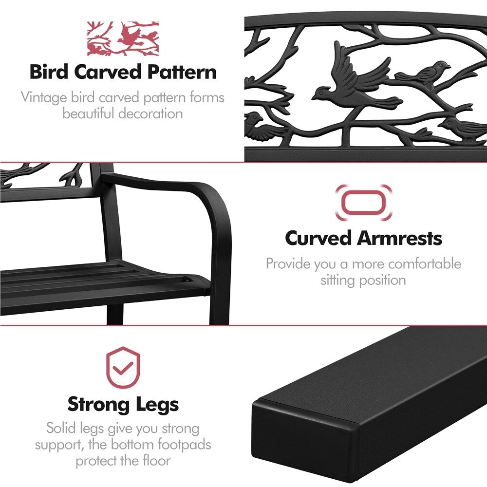Apportez une touche de nature à votre espace extérieur avec notre banc de jardin Yaheetech de 15 m. Le motif d'oiseaux vintage du dossier embellit votre espace et favorise la circulation de l'air, tandis que l'assise légèrement incurvée, large et profonde, offre un confort optimal. Fabriqué en fer robuste avec un revêtement imperméable protecteur, ce banc est conçu pour durer et résister à une utilisation intensive. Supportant une charge maximale de 180 kg, il convient parfaitement aux parcs, jardins, cours, mariages et bien plus encore. Les accoudoirs incurvés assurent un confort optimal, et l'assise, avec ses rayures verticales, favorise la circulation de l'air et une répartition idéale du poids. Sa finition résistante aux intempéries garantit sa durabilité quelles que soient les conditions climatiques, et son montage est simple grâce aux outils et instructions fournis.