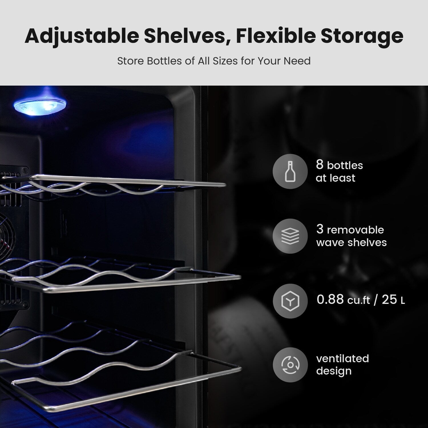 - Rangement polyvalent : Peut accueillir 8 bouteilles de Bordeaux standard de 750 ml grâce à trois casiers à vin amovibles, offrant une grande flexibilité pour différentes tailles et types de bouteilles.